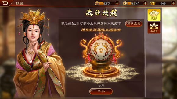 如果是真的打算长期玩这款手游的话,这边还是建议搞个战鼓,虽然激活战鼓需用几十元,但激活了以后就不再需要,只用要积攒一定的元宝就可以升星,战鼓给全武将属性加成,越后期越强大,真心值得推荐一下。