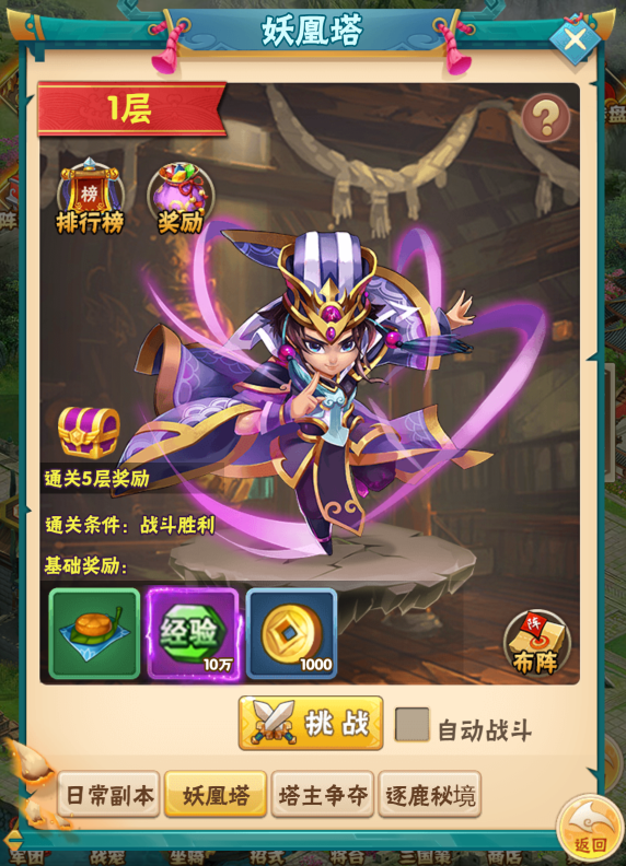 当主角等级达到30级时会开启妖凰塔,每通关一层妖凰塔,都会固定获得10万经验值,前期的冲级一大助力。