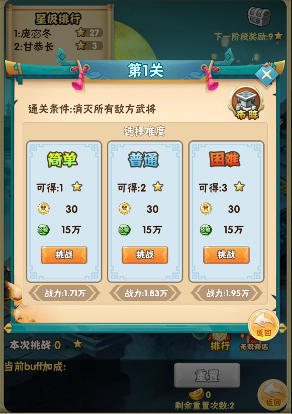 当主角等级达到40级时会开启三国征战,三国征战可以获得大量的威名和经验值,开始挑战后,会锁定玩家身上的主角和武将的等级和属性,如果不重置就无法刷新主角和武将的等级与属性,三星通关才可以对该关卡进行扫荡,一键扫荡会扫荡到当前三星通关最高关卡的前一关,推荐前期在达到无法再次提升等级和装备的情况下再去打三国征战副本。