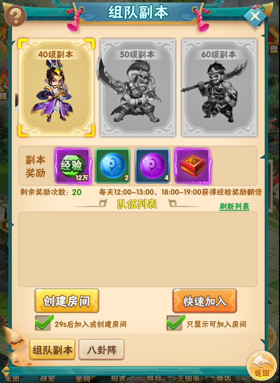 当主角等级达到35级时会开启组队副本,组队副本可以大量的经验,是每日固定的经验来源,中午12点至1点、下午6点至7点期间组队副本可以获得双倍的经验值。