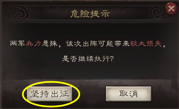 然后关孙两位将军跟在后面,继续收拾2级资源点,因为每一名武将都有体力限制,所以我们的开荒队主力是不能用来打空地的,用第2梯队打就可以,大概打下4-5块2级资源地之后,主力菜刀队已经到了6级,两人加起来1200兵力,这时候我们就可以图谋三级资源点了,但是和2级资源点不同,三级资源地三名将领一共2400人,多出的一名将领使得我们无法战胜对方,系统会提示你两军伯仲之间,不要紧,我们可以合力,首先把一直给我们开路的第二梯队拉回来,然后在第一梯队进攻之后,让第二梯队也进攻,不用管系统提示你兵力差距过大,能赢。