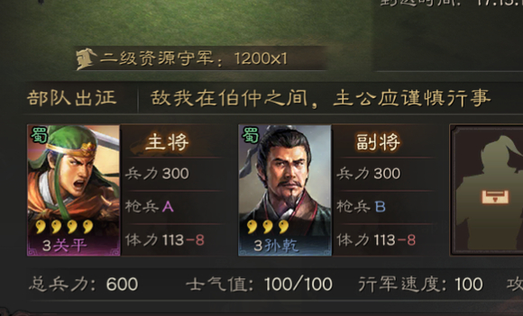万事开头难,首先先用关平和孙乾俩新手赠送将领把周围的空地打下,开始能组建两支部队,另一队也是如此,走两个方向,先打空地或者一级地,一级地按空地处理,一开始我们的关孙两位将军双双三级,另一只队伍新组建则全是一级,让第二梯队去打空地,第一梯队也去,至少先把二级资源点和主城连接起来,等到完成这一步之后,此时我们的侦察兵已经以3min一块地的速度把周围的2、3级资源点侦查的差不多了,但是此时两位将军只能带600兵马,面对2级资源地里的1200驻军,虽然完全达不到系统推荐,但是不用在意,在侦查结束兵种克制的情况下,稳赢。