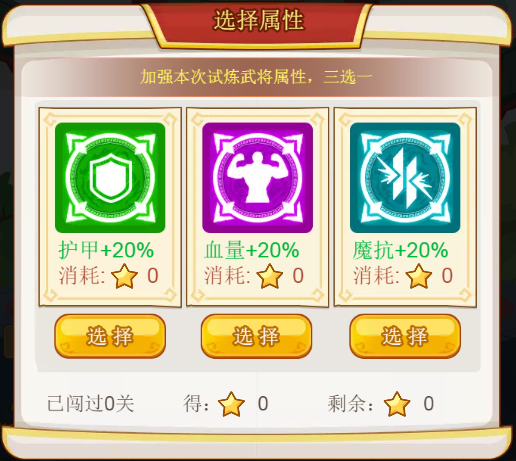 金星每过三关可以用来购买一次属性,属性仅在本轮挑战中生效,如下所示,大猫由于一直没能完美通过所以并买不起想要的属性。