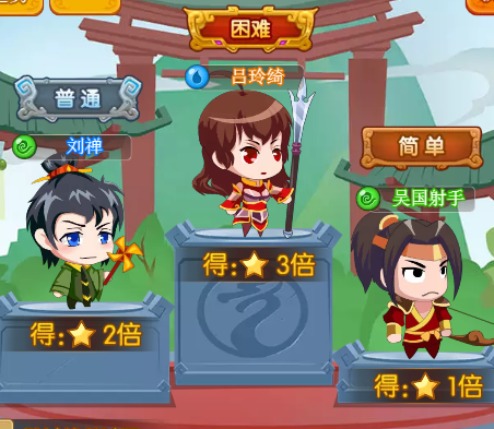 挑战对象分为困难对手,普通对手,简单对手(刘禅居然比吴国射手强?)。三个难度分别对应了1/2/3倍的金星奖励。