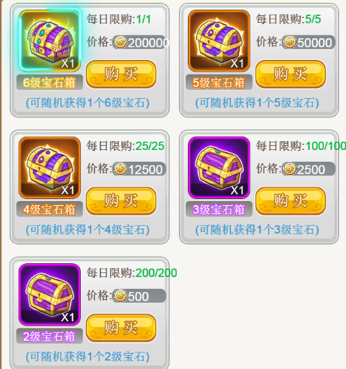 在这里大猫要提示一下大家,经过计算:6级宝石箱性价比>5级宝石箱>4级宝石箱=3/2级宝石箱。