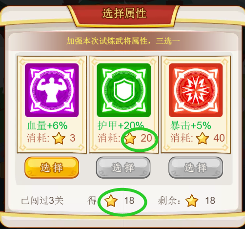 上面这三个选项怎么说呢,40颗金星+5%的暴击未免也太贵了,最合算的是3颗星换6个血量,虽然加成较少但是性价比绝对是高于护甲2倍以上。金星可以留着下次再选,但是也要酌情考虑自己的实力,万一金星没用完人挂了那就不合算了。