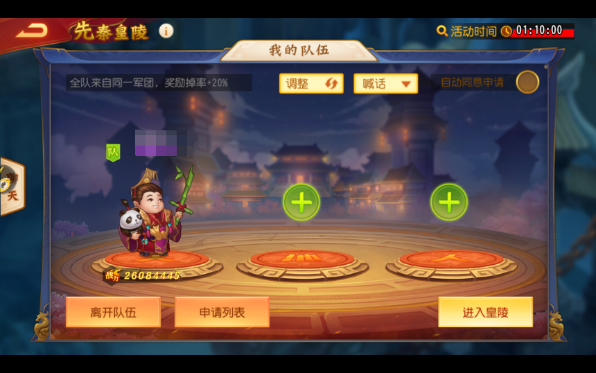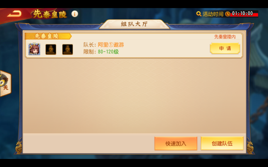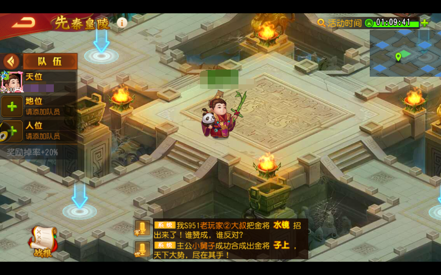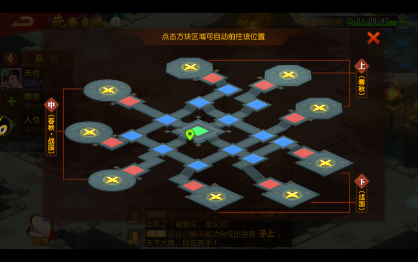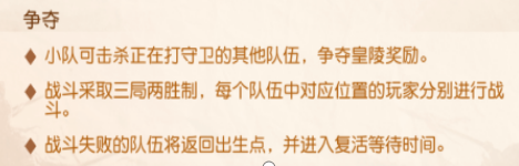 先秦皇陵实际上是一个副本地图,玩家可组队进入,小队人数上限为三人,当然也支持一个人进入副本。当玩家进入先秦皇陵之后,只有队长才能操作,如移动或者攻击其它小队等。奖励通过皇陵内刷怪的方式掉落,多人组队打怪速度较快,且不同军团的玩家也能组队,同军团的玩家组队则能够增加材料掉落的概率。