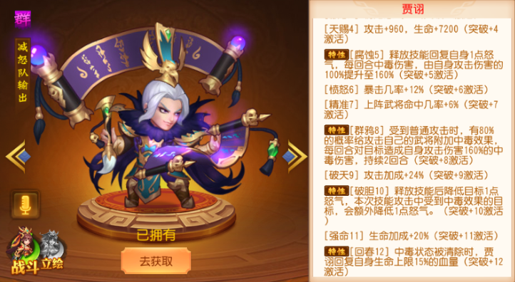 贾诩的技能效果可对敌方前排造成自身攻击力172%的法术伤害,并有60%概率附加中毒效果,毒伤效果触发后每回合可对目标造成自身攻击力100%的中毒伤害,毒伤效果在突破+5会提升至160%,毒伤效果持续2回合。