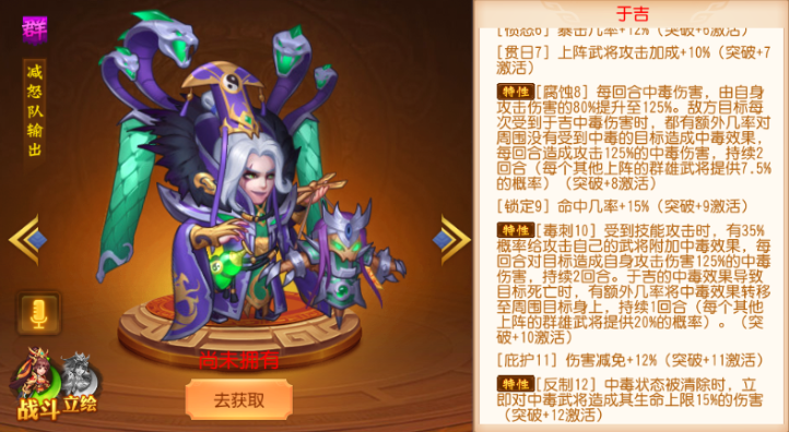 于吉从技能上面讲其攻击更为随机,一次释放对敌方随机3人造成于吉自身攻击力140%的法术伤害,并有60%概率附加中毒效果,每回合对目标造成自身攻击力80%的中毒伤害。毒伤效果在突破+8之后提升至125%,整个中毒效果会持续2回合。