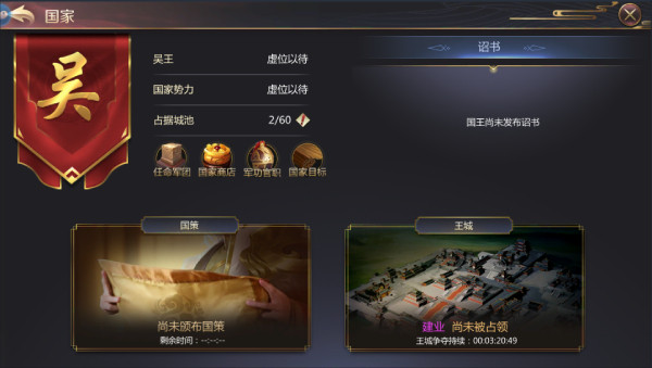 此为游戏最大特色之一,游戏提供了世界作为公告战场,主公可全天在世界上进行战斗。 还有国家任务系统,整个国家的所有玩家需要全力配合与其他国家战斗,完成任务,真正 体验百人国战,达到真正的高峰体验。