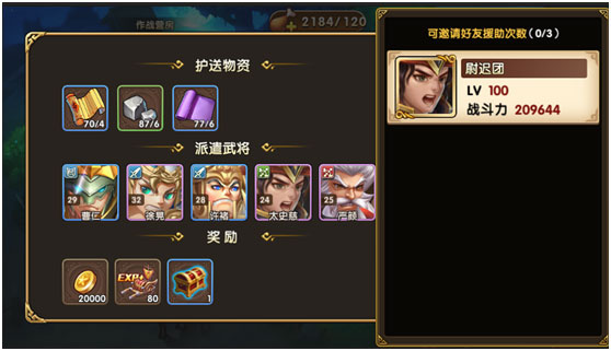 说到护送物资,可别忘了派遣上武将。不派遣武将护送的马车,轻易就会被洗劫一空。如果担心自己实力不足,可以多加好友,抱抱大神们的大腿,邀请帮忙护送。不过每名好友每天仅能被邀请一次,所以这个机会还是等刷新出高级马车时再用上吧,低级马车完全可以靠自身实力去护送。