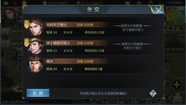 通过外交达成盟约,相互扶持是争霸赛的不二选择,只有未开战前才能确认君臣关系