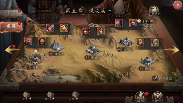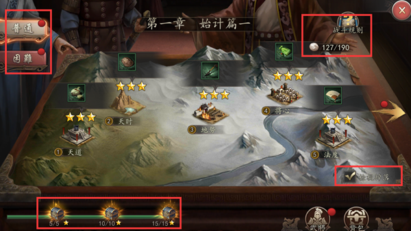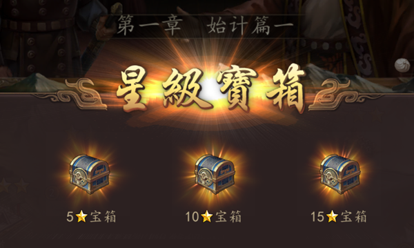每个章节下各有5个关卡,每个关卡根据通关后武将的存活情况会获得1-3星的评价,达到5星、10星、15星,则可以领取相应的宝箱奖励(元宝、铜币等)。