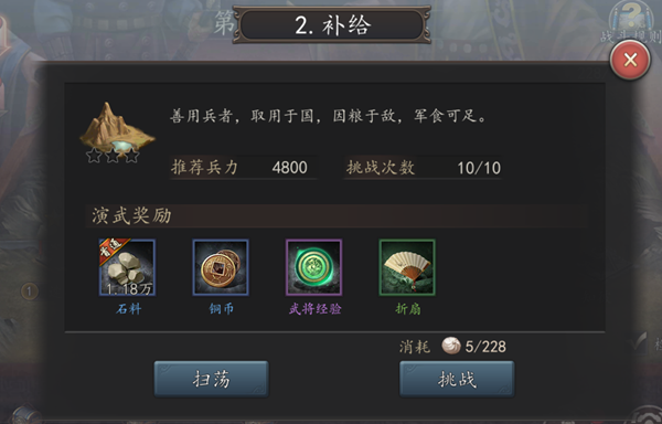 点击演武地图中的小节图标,可预览该小节演武详情,包含推荐兵力、每日可挑战次数、演武奖励及体力消耗等,确认无误后,可开启挑战,进入演武布阵。