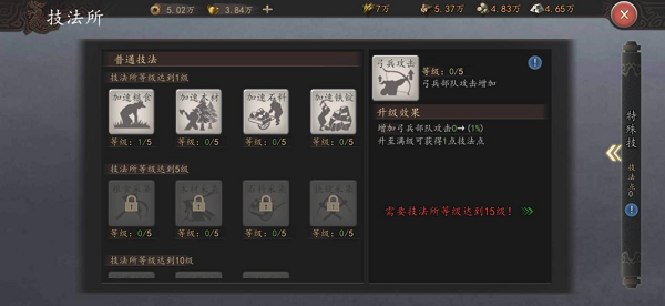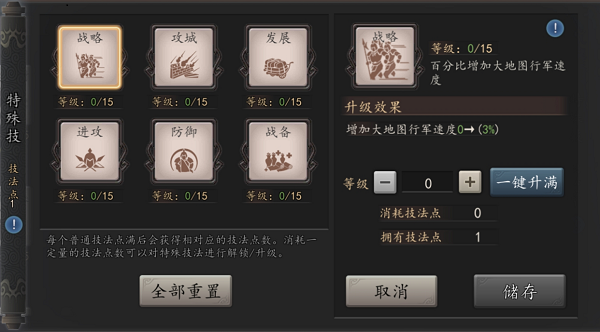 3、“特殊技”主要提升玩家行军战备攻城的相关属性,因技法点数获取相对较难,玩家在升级“特殊技”时需结合目前状况谨慎加点。