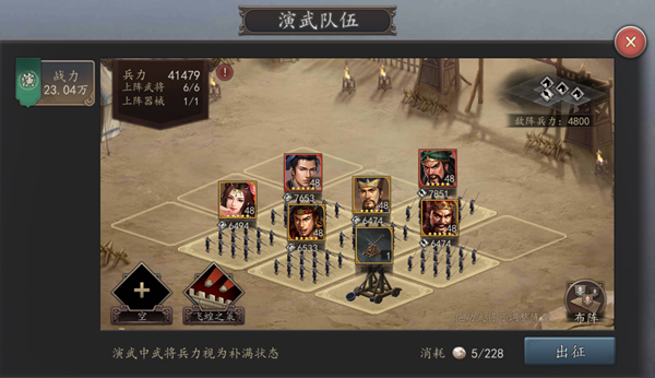 演武中武将兵力视为不满状态,根据兵种相克技巧,合理布阵可提高胜率。例如,在后排弓兵旁放置一个枪兵,可以有效拦截敌方绕后的骑兵。