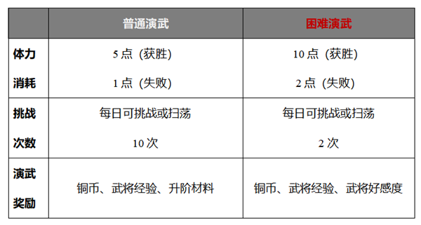 游戏中的演武副本分为普通副本与困难副本2类,消耗及掉落略有区分。