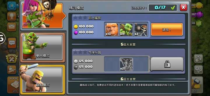 当你的大本营三级后(不知道2本可不可以...),玩家也可以通过练习模式来获得金币和圣水,这个可以在严重缺资源的时候帮到你。这个模式相当于一个进攻教程,所有的兵力都是系统出的,兵种怎么布置也会有提示,就是送给玩家“资源”的一个模式(只能获取一次资源),所以要利用好。