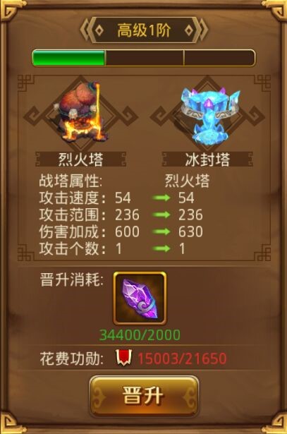 (二)晋升:消耗风雷石和功勋,提升战塔的等级。等级分为初级(1、2、3阶)、中级(1、2、3阶)高级(1、2、3阶)顶级(1、2、3阶),等级越高,塔防时的战力就越强,且塔的形状会发生变化。塔的晋升,需要大量功勋,只能日积月累。功勋在过关时送,也可以在商店购买以及用各种活动奖励兑换。