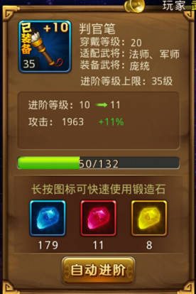 【装备进阶】装备进阶需要锻造石,可以提升装备的战力。值得注意的是,装备进阶也是有等级限制的。比如:白色装备最多进阶到10级,蓝色装备最多进阶到35级。饰品也是可以进阶的,消耗的是饰品进阶石。