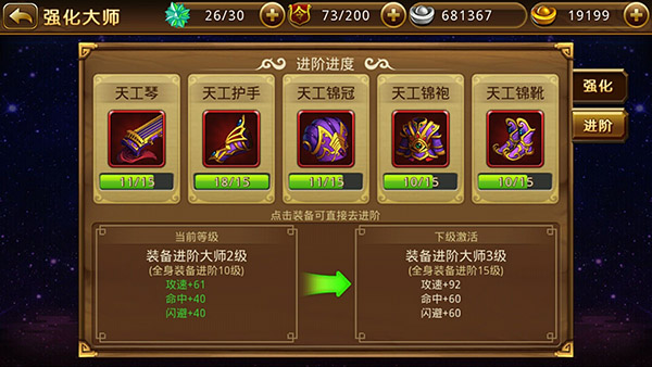 【装备强化】装备强化需要银两,可以强化到和武将等级一样的级别。如果一个武将装备齐五件装备时(除配饰)可开启强化大师,整体强化或进阶每5级增加一次属性,所以不建议单件装备提升,整体平衡提升更优。饰品强化不仅需要银两,更需要饰品经验配饰。比如:金色饰品,需要金色经验配饰。