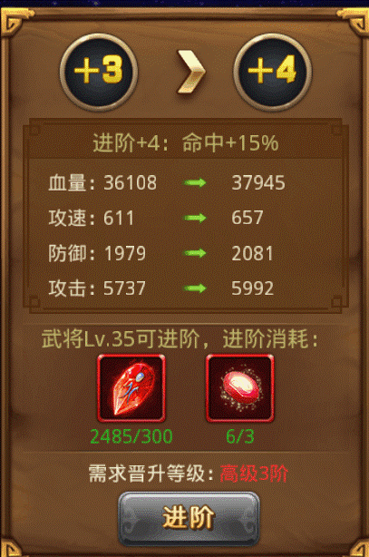 (四)进阶。武将的进阶,需要消耗进阶石和不同等级的将元(初级晋升不需要将元)。且需要达到一定武将等级,才能实施相应的进阶。