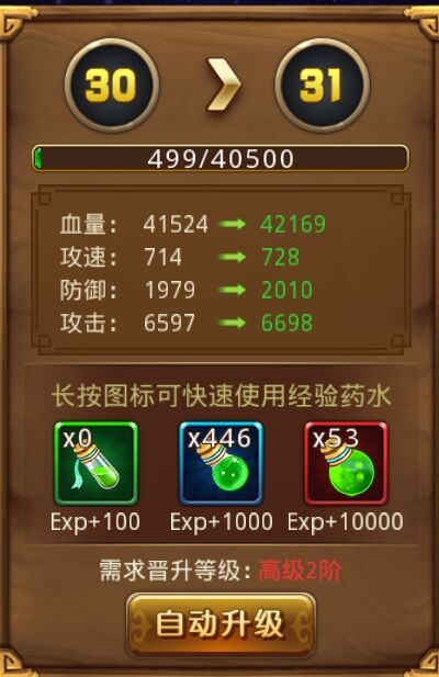 (三)升级。武将升级,需要经验药水。武将最多能升到比主公等级高5级。且需要战塔达到一定等级才能升级。