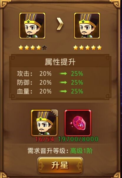 (五)升星。武将的升星,需要消耗升星石和一定数量的该武将信物(一星不需要信物)。2-5星分别需要9、25、40、54个武将信物,随着星级的提升,需要的武将信物也随之增加。且需要战塔达到一定等级才能升星。升五星需要战塔升到高级1阶。