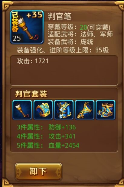 装备分为两种系列:军师和法师的一个系列;射手和炮手的一个系列,所以一套装备不用时,可以给另外的将留着。装备的部位分为:武器、头盔、铠甲、战靴、护手和饰品。(这是判官套装的图)