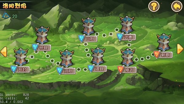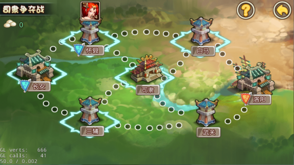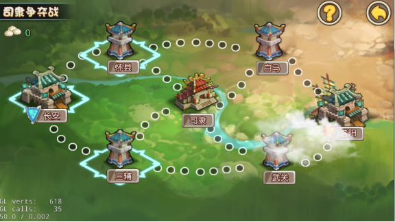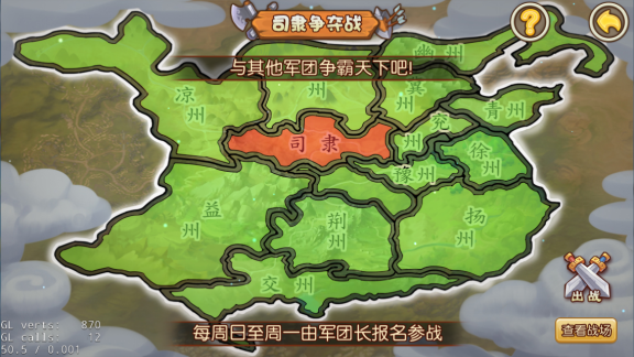 以司隶争夺战的战役地图为例,进入军团战的玩家会分为两个势力。左边的势力从以长安为据点,右边的势力以洛阳为据点,两个据点城市之间有5座城市供玩家争夺。