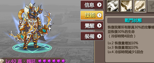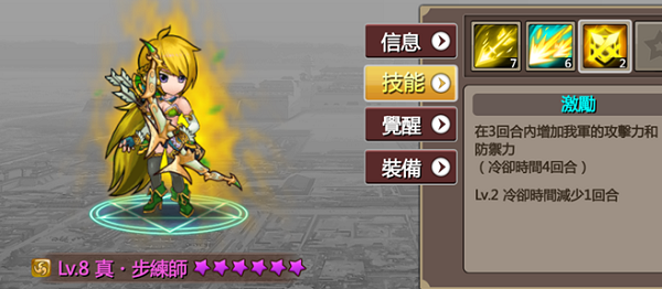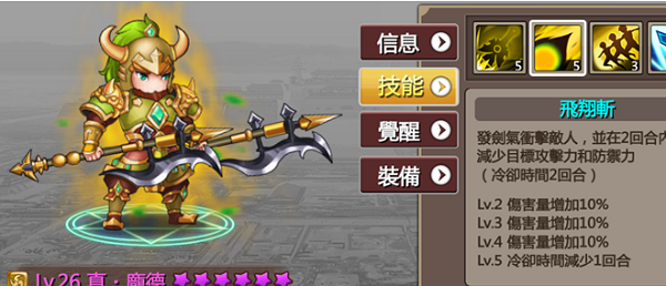 三技 三回合内增加整队攻击力&防御力此招在打王时非常实用 增加防御可以挡掉不少伤害