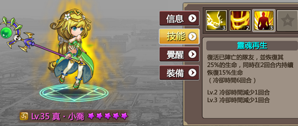 三技 复活死亡武将 恢复25%HP 并在两回合给予复活武将恢复15%HP的BUFF