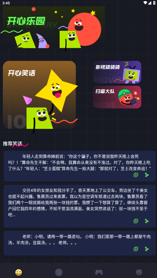 樱花迷你秀不用实名认证版是一款集开心笑话、脑筋急转弯、描雷与游戏攻略为一体的应用。在这里拥有着大量笑话,涵盖爱情篇、恐怖篇、校园篇等等,用户可以根据喜好进行选择,提供预览模式、闯关模式、选词模式三种脑筋急转弯模式,闯关模式是用户根据题目选择答案,预览模式是不需要回答的,点击即可查看答案,而选词模式则是进行填词,根据缺少的成语进行选择。还有扫雷小游戏,提供了简单、中等、困难模式,以及各种游戏攻略内容。