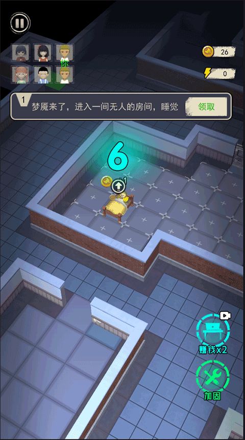 --还需要在尽快的时间中躺在床上,只有躺下才能获取金币,升级我们的门还有防止炮塔攻击猛鬼;
