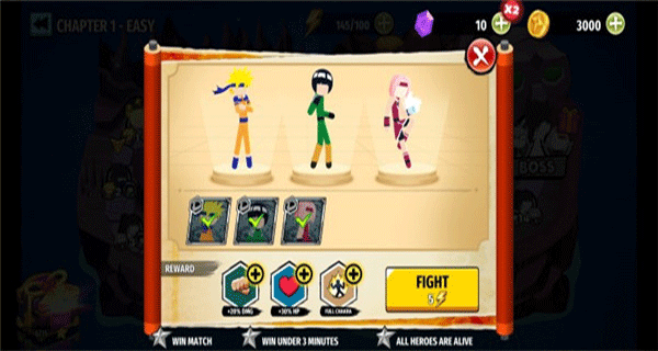 2、游戏中拥有丰富的角色供玩家解锁选择,你可以自由选择3位忍者出场并调整出战顺序,合理的搭配阵容可以让你更加轻松的赢得胜利;