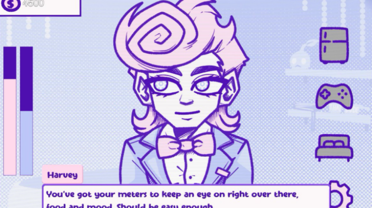 1、游戏中玩家的任务就是要让哈维保持健康快乐,你要时刻注意饮食和心情,角色的状态计量表在左边,左边的为饱食度,右边为心情