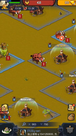 您是否已注意到地图中心的神秘建筑?其实是原始遗迹啦!部落作战,拿下遗迹,杀敌最多的玩家即可获得本服最高头衔:大酋长。想想动动手指就可以召唤一场野猪雨;挥一挥衣袖就可以勾起毁灭性的神之怒火,感觉真的不要太棒!更妙的是您可以给任意一个玩家颁布头衔:给讨厌的人懦夫,傻瓜等称号,削减其实力;或是让您的死党当上族长,长老之类的,有福同享。3、全球同服