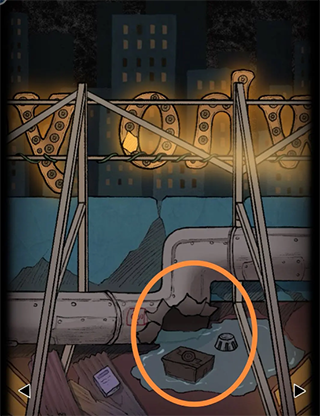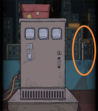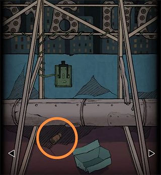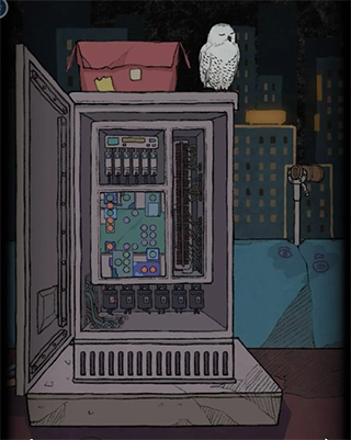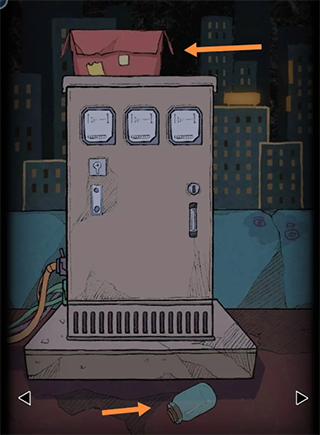3、在地上捡起玻璃瓶,注意到电箱上方有一只孵蛋的猫头鹰,暂时记下位置后续处理。