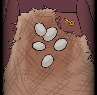 12、将壁虎喂给猫头鹰,猫头鹰会起身站到一旁,从它的窝里获取门帘(右)和钥匙 B。