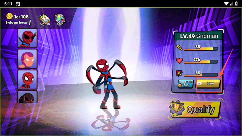 4、要想角色更加强大,玩家可以点击Free来升级角色等级,提升战斗力、生命值和暴击力