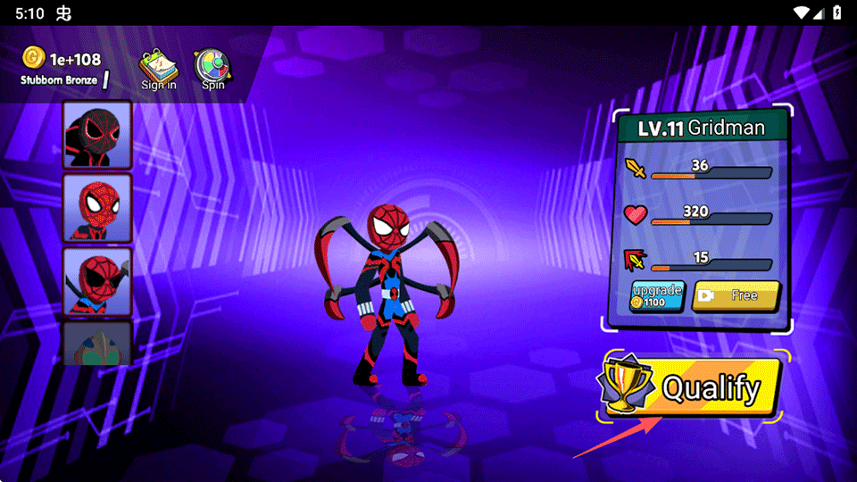 1、打开游戏后,首先在左边所有角色中选择一个你喜欢的英雄,并点击右下角Qualify
