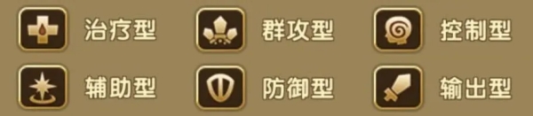 治疗型、群攻型、控制型、辅助型、防御型、输出型。