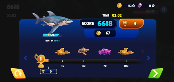 5、可以收集不同的鲨鱼并组成自己的强大鲨鱼队伍,给游戏带来更加深入的玩法体验。