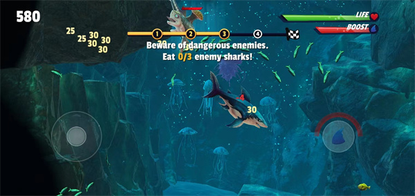 7、在这里我们要注意,如果碰到比自己还大的鲨鱼,一定要躲避,不然你就会被它们给吃了;