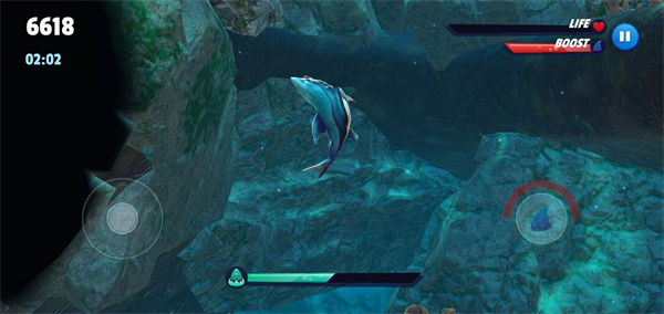 2、首先是熟悉左边的按键,这个按钮是控制鲨鱼移动以及方向,而右边的按键点击后可以加快鲨鱼的移动速度;其次就可以吃小鱼来让自己升级;