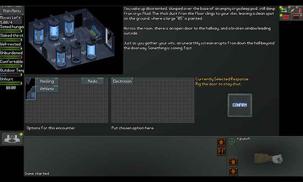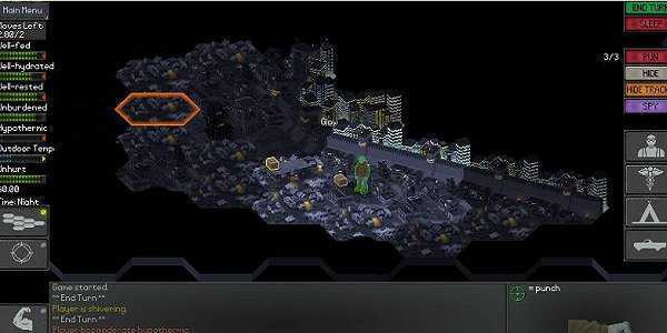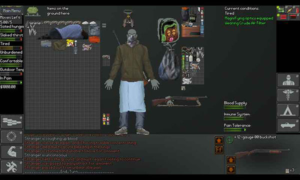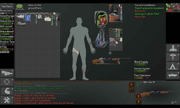 再说开局,开局的时候有只狼(狗人),可以选择关门(machanic,electrician,hacking)选择怀柔(植物学,hinding)选择硬来(strong,melee)前面两种都会安然无恙,后一种会随机受一些伤,不过受伤也有好处,你得到一只狗人的尸体,而且你如果有traping技能的话用玻璃渣剥皮会得到狗皮斗篷,保暖效果非常好。很多时候一开始找不到衣服穿一不小心冻死,这件斗篷挺不错的。