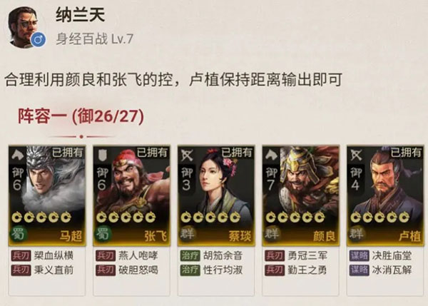 第三、虽然为五橙将,但战法大多使用的是A级战法,作为开荒阵容门槛并没有非常高。