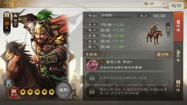 作为一个武力值成长不错的骑兵,颜良不怕反击的特点使其可以首回合无所顾忌地输出,再加上自身战法使得颜良可以在攻击对面武将的同时将对方武将眩晕住,从而暂时性对敌方造成减员。