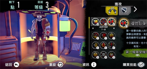 在游戏中每完成一个任务就会得到一定的经验值,升级后就会获得技能点,在出生点使用技能值可以进一步提升主角的能力。