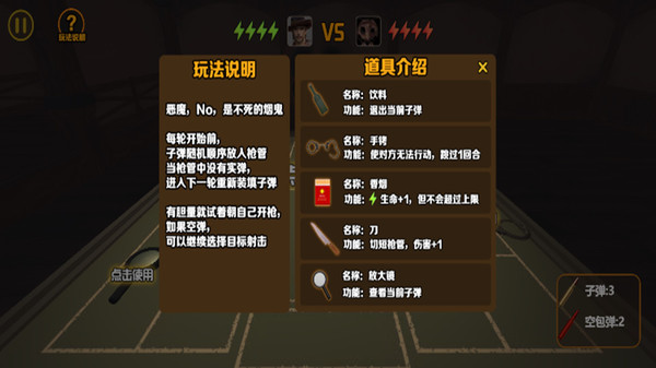 3、游戏的玩法很简单,和恶魔进行PK,猜对子弹数量的方式,获得PK的胜利,还有道具帮你。